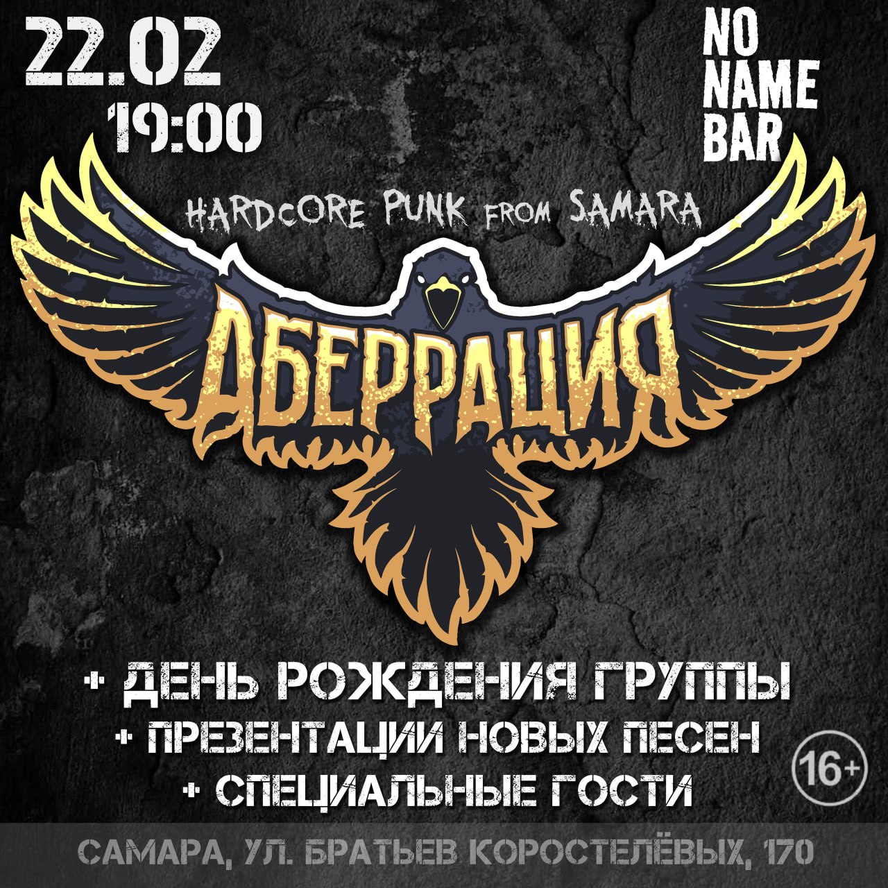 Группе «Аберрация» весной исполняется 18 лет — совершеннолетие! Приглашаем отметить эту серьёзную дату вместе с нами! В программе будут, как и боевики команды, так и новые песни, которые ещё никто не слышал! Возможно даже выйдет целый альбом, который вы сможет услышать и увидеть из первых уст!