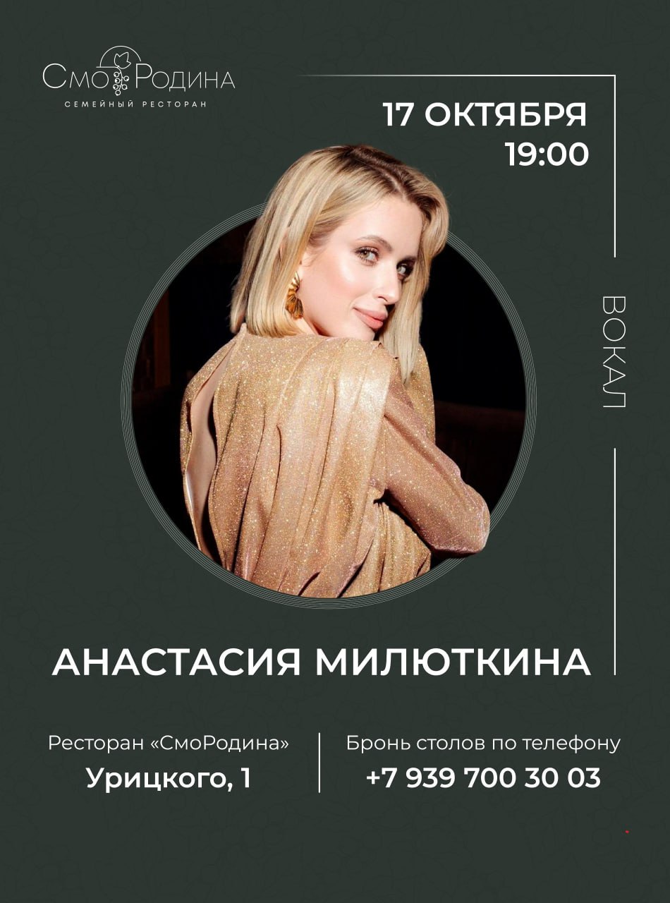 Анастасия Милюткина 17 октября в 19:00 в ресторане «СмоРодина».