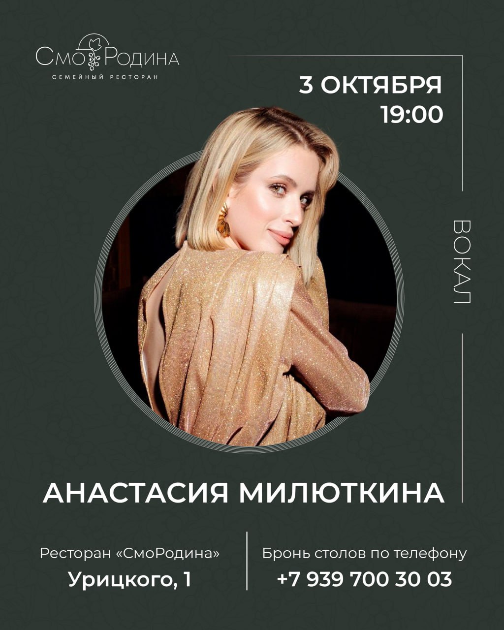 Анастасия Милюткина 3 октября в 19:00 в ресторане «СмоРодина».