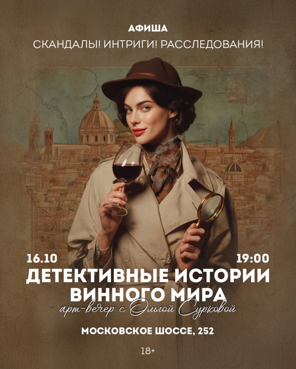 Приглашаем вас вместе с сомелье-экскурсоводом Ольгой Сурковой погрузиться в тайны благородных напитков — ведь их, признаться, немало! В этих историях замешаны известные имена, великие державы и страсти. Всё переплелось в клубок загадок и интриг. Заинтригованы?