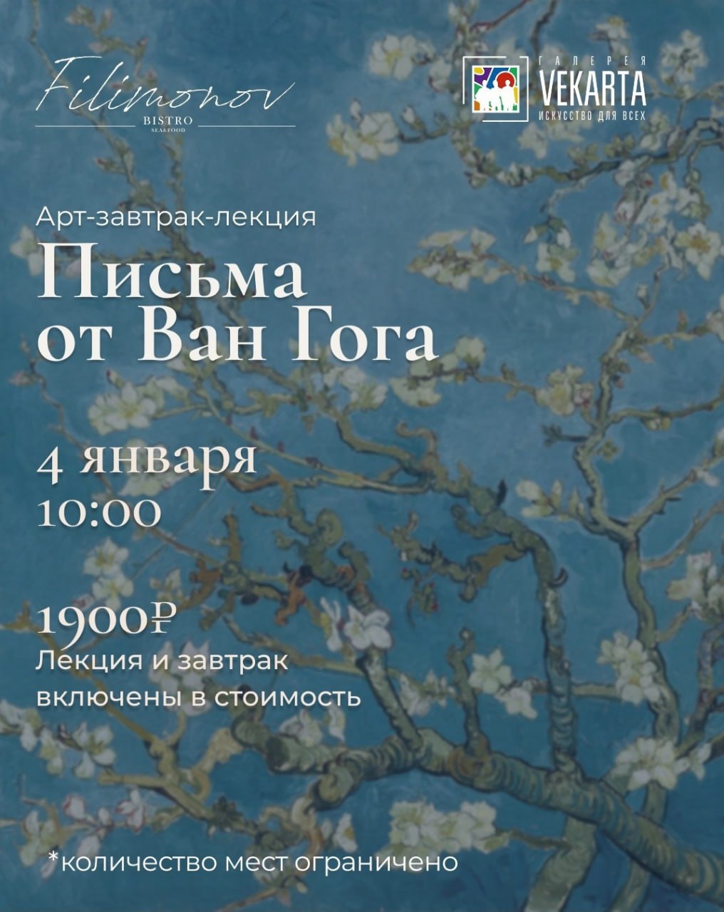 В чудесном ресторане «Filimonov» за чашкой кофе мы откроем письма Винсента к брату Тео, самые честные, живые и трогательные строки в истории искусства.