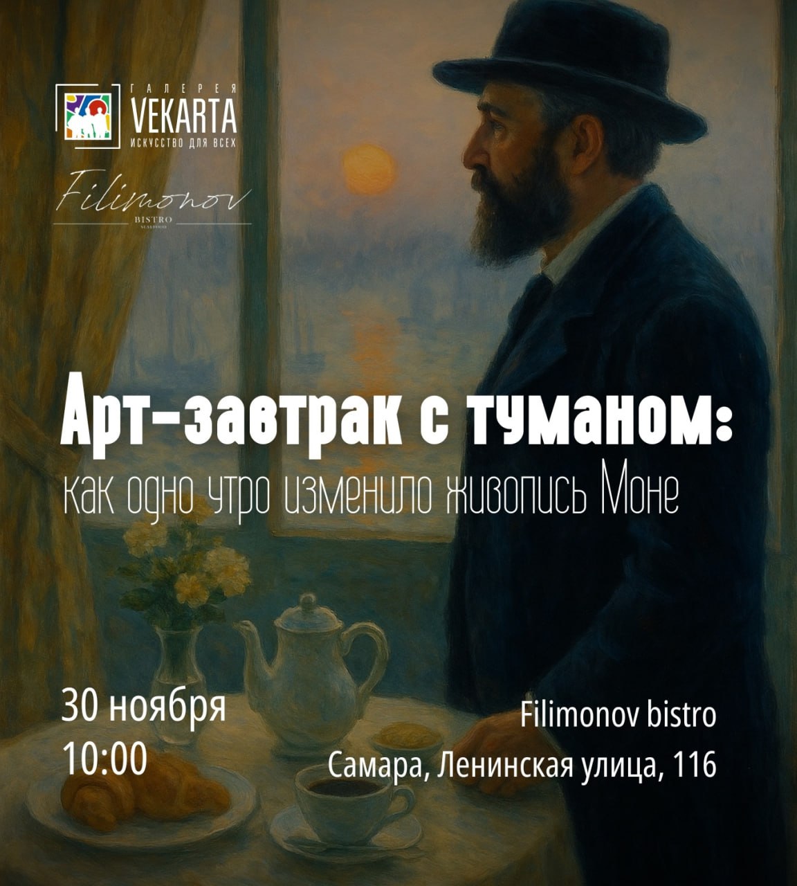30 ноября мы встречаемся в изящном зале ресторана Filimonov, чтобы перенестись в то самое туманное утро, когда Клод Моне увидел мир иначе. С этого момента начался импрессионизм — живопись света, мгновения и новых чувств.
