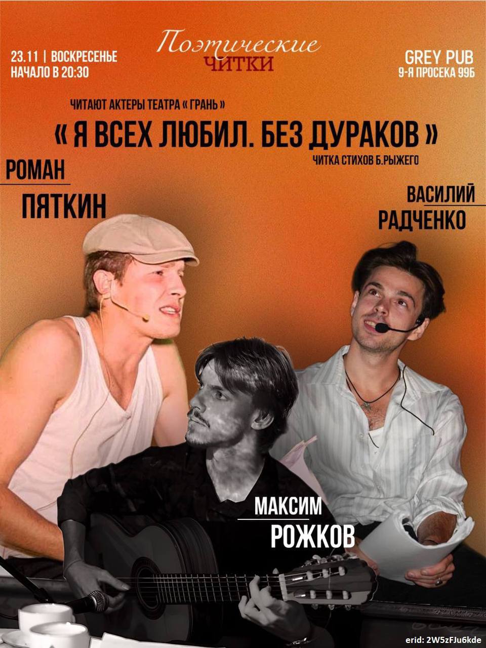 В этот вечер вас ждет встреча с поэзией Бориса Рыжего, чьи слова звучат как голос целой эпохи. Актеры театра «Грань», Василий Радченко и Роман Пяткин, проведут вас через строки поэта, раскрывая скрытые эмоции, маленькие истории и глубину чувств. А гитарист Максим Рожков наполнит атмосферу мягким и проникновенным звучанием.
