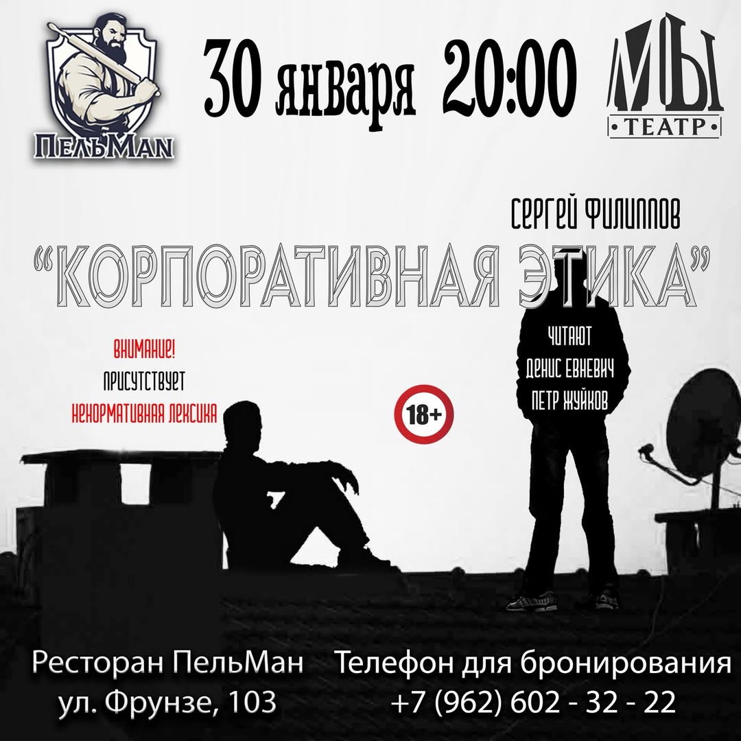 «Корпоративная этика» — пьеса в одном действии, в которой ночью на крыше многоэтажки оказались двое: один залез, чтобы спрыгнуть, а другой — чтобы спасти!