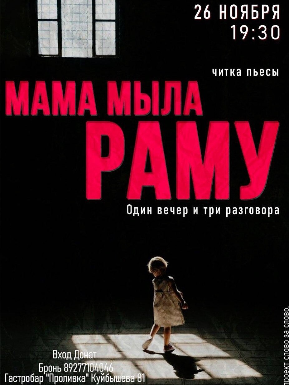 Современная пьеса Владимира Зуева «Мама мыла раму» — остроумная, пронзительная и местами абсурдная история о семье, где прошлое и настоящее переплетаются в причудливый узор недоговорённостей, обид и попыток понять друг друга.