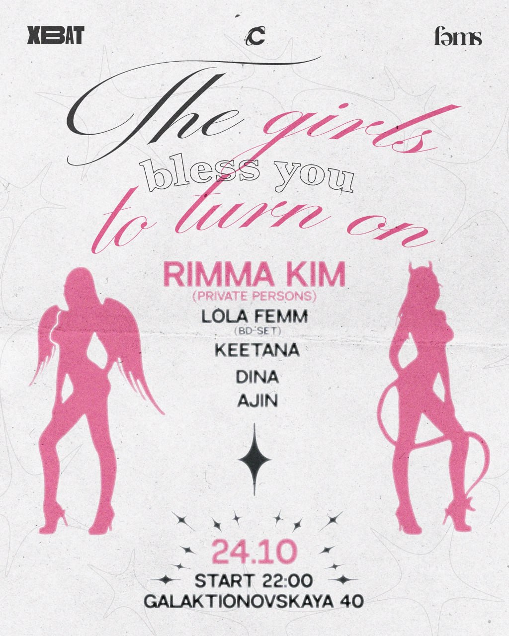 Не думая о поводе, устраиваем откровенный Femme Fatale — играют только девчонки! И мы собрали всех: от локальных звездочек до подруг из столицы. Но главным козырем предстоящей ночи станет ключевая фигура электронной фауны Москвы, диджей, резидентка PRIVATE PERSONS и основательница концептуальной вечеринки-комьюнити (only for girls) FEMS — RIMMA KIM.