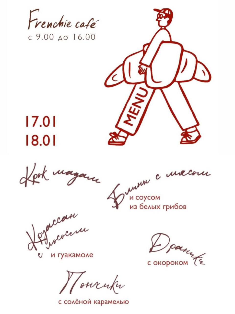 17.01 и 18.01 приезжает команда Frenchie cafe с гостевым бранчем и все выходные с 9:00-16:00 будут готовить для вас.