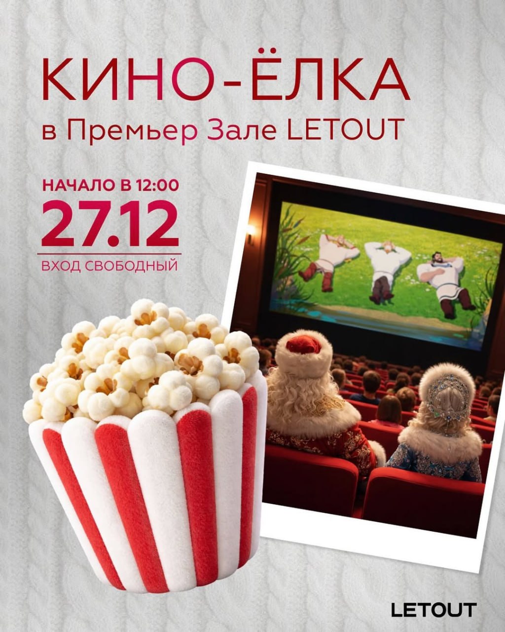 Уже 27 декабря в 12:00 Премьер Зал LETOUT приглашает маленьких гостей и их родителей на по-настоящему новогодний праздник. Дед Мороз и Снегурочка, Конь Юлий и Алёша Попович, весёлое шоу, подарки каждому ребёнку и показ мультфильма «Три богатыря и Свет клином» — всё, чтобы этот день запомнился надолго.