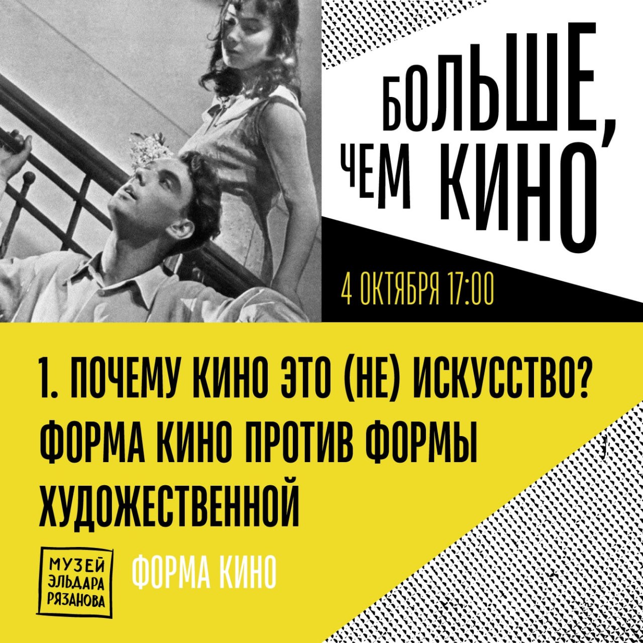 Киношкола «Больше, чем кино». Занятие 11. «Почему кино это (не) искусство? Форма кино против формы художественной» 4 октября в 17:00 в музее Эльдара Рязанова. 16+