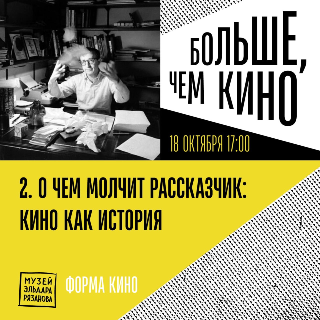 Киношкола «Больше, чем кино». Занятие 2 «О чем молчит рассказчик: кино как история» 18 октября в 17:00 в музее Эльдара Рязанова. 16+