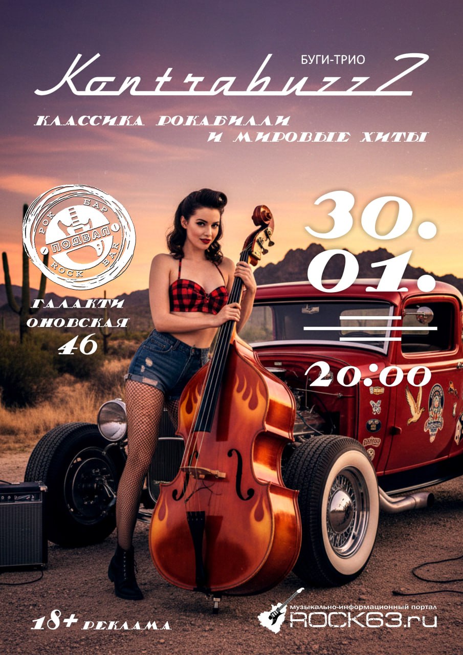 В этот вечер на сцене старейшего рок-бара Самары играет KontrabuzzZ — квинтэссенция пламенного рокабилли 50-х годов прошлого века. Элвис Пресли, Билл Хейли, Джерри Ли Льюис, Чабби Чекер... Если эти имена тебе знакомы, в последнюю пятницу января ты не можешь пропустить этот концерт!