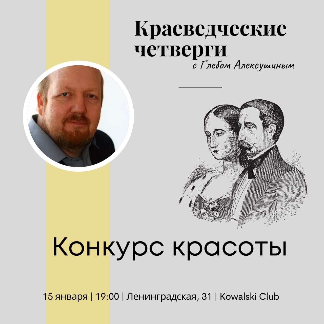 Краеведческий четверг с Глебом Алексушиным. Конкурс красоты 15 января в 19:00 в Kowalski Club. 12+
