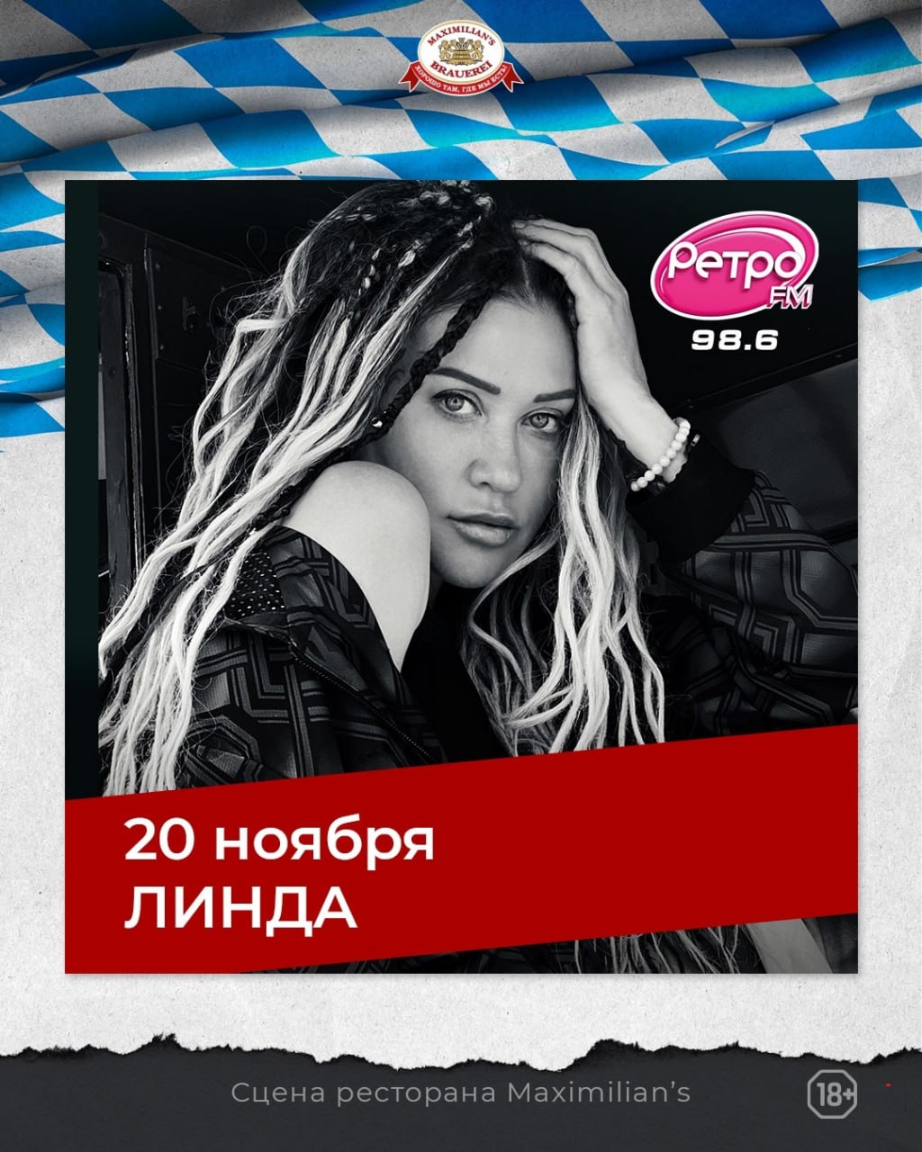 Линда 20 ноября в 20:00 в ресторане «Максимилианс». 18+