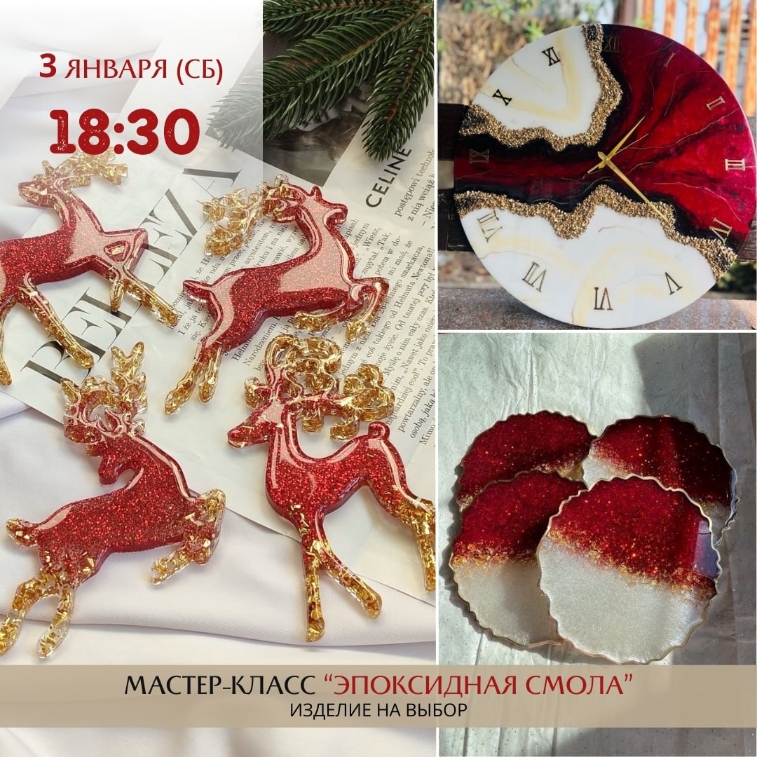 Волшебный мастер-класс «Эпоксидная смола», создание елочных игрушек и не только из эпоксидной смолы, изделие на выбор. Стоимость от 1500₽.