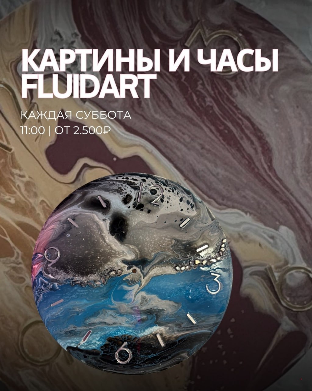 Два в одном! Создайте абстрактную картину или часы в технике Fluid Art или раскрасьте очаровательных мишек! Идеально для семейного творчества! Стоимость от 2500 рублей.