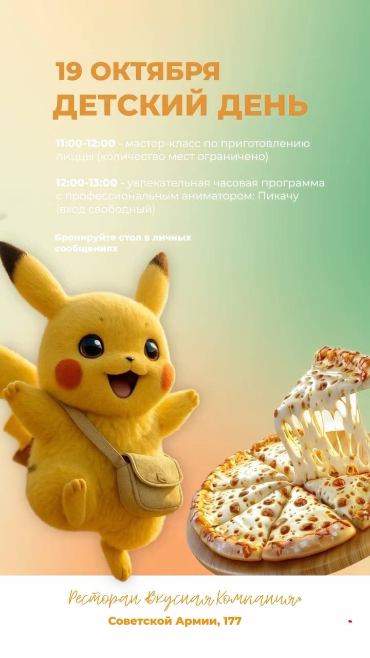 После мастер-класса по приготовлению пиццы, аниматор Пикачу ждёт всех детей, чтобы устроить настоящий праздник!