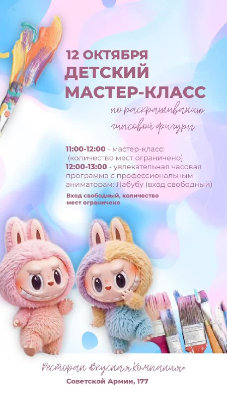 12 октября в ресторане «Вкусная Компания» пройдет детский мастер-класс по раскрашиванию гипсовой фигуры Лабубу.