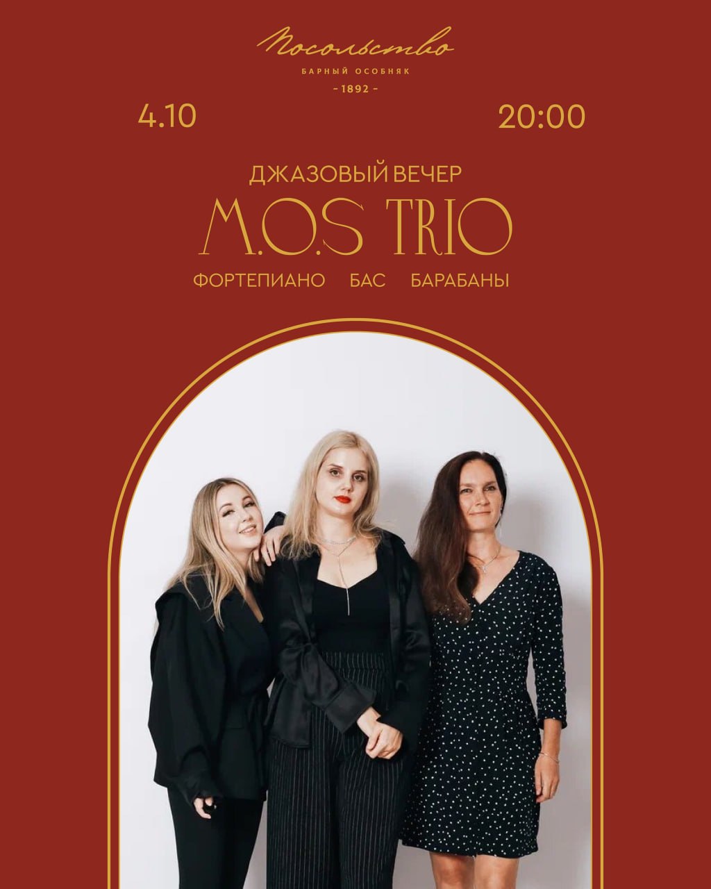 В эту субботу M.O.S Trio исполнит джазовые аранжировки Бетховена, Магомаева и неаполитанских песен. Приглашаем насладиться чувственными мелодиями и ритмом осеннего вечера в «Посольстве»!