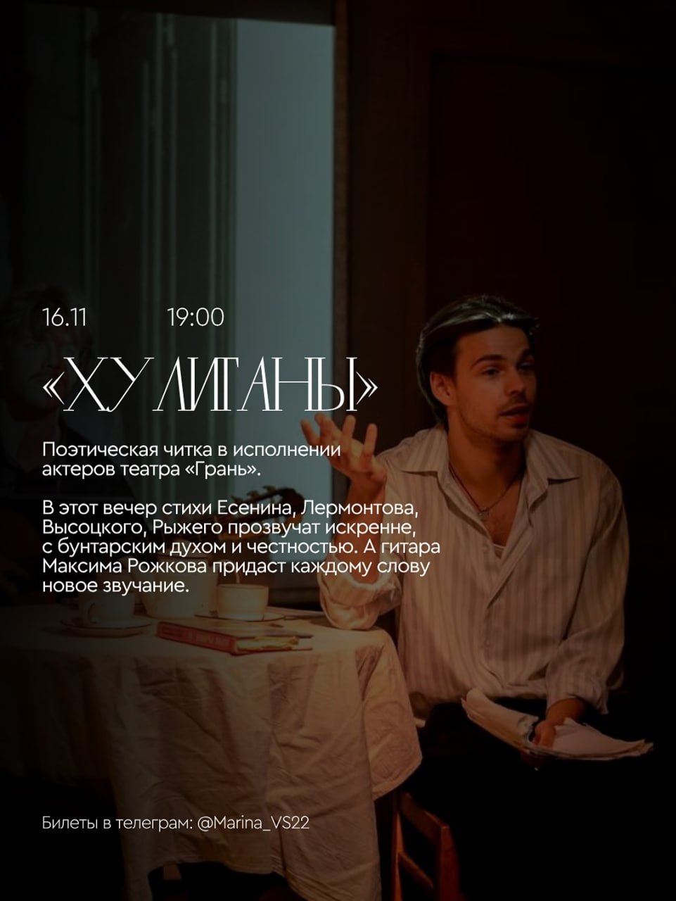 Стихи Есенина, Лермонтова, Высоцкого, Рыжего прозвучат искренне, с бунтарским духом и честностью. А гитара Максима Рожкова придаст каждому слову новое звучание.
