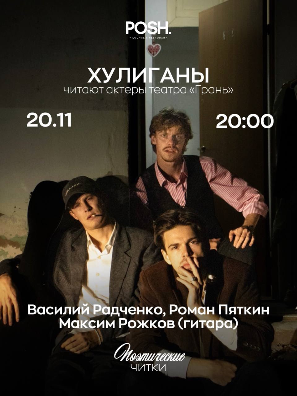 Актёры театра «Грань» Роман Пяткин и Василий Радченко станут проводниками в мир хулиганской поэзии, где страсть граничит с отчаянием, любовь — с ненавистью, а правда — с ложью.