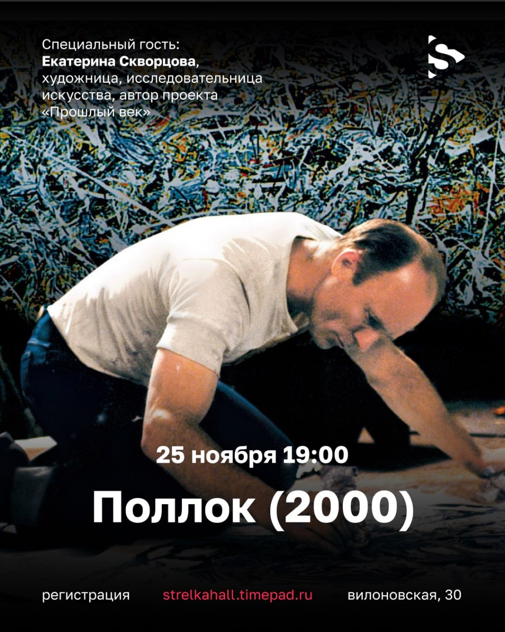 На встрече проекта-резидента «Прошлый век» вместе с художницей и исследовательницей искусства Екатериной Скворцовой t.me/proshlyvek мы посмотрим фильм «Поллок» (2000) — биографическую драму о жизни и творчестве Джексона Поллока, одного из главных новаторов абстрактного экспрессионизма.
