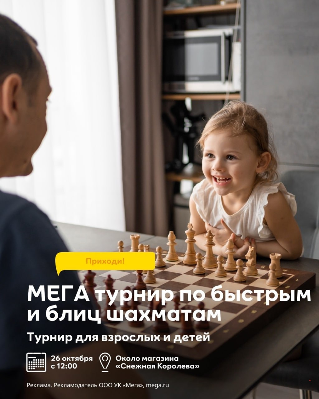 26 октября в МЕГЕ пройдёт шахматный турнир: для взрослых в формате блиц, для юных участников (до 17 лет) — в быстрых шахматах.
