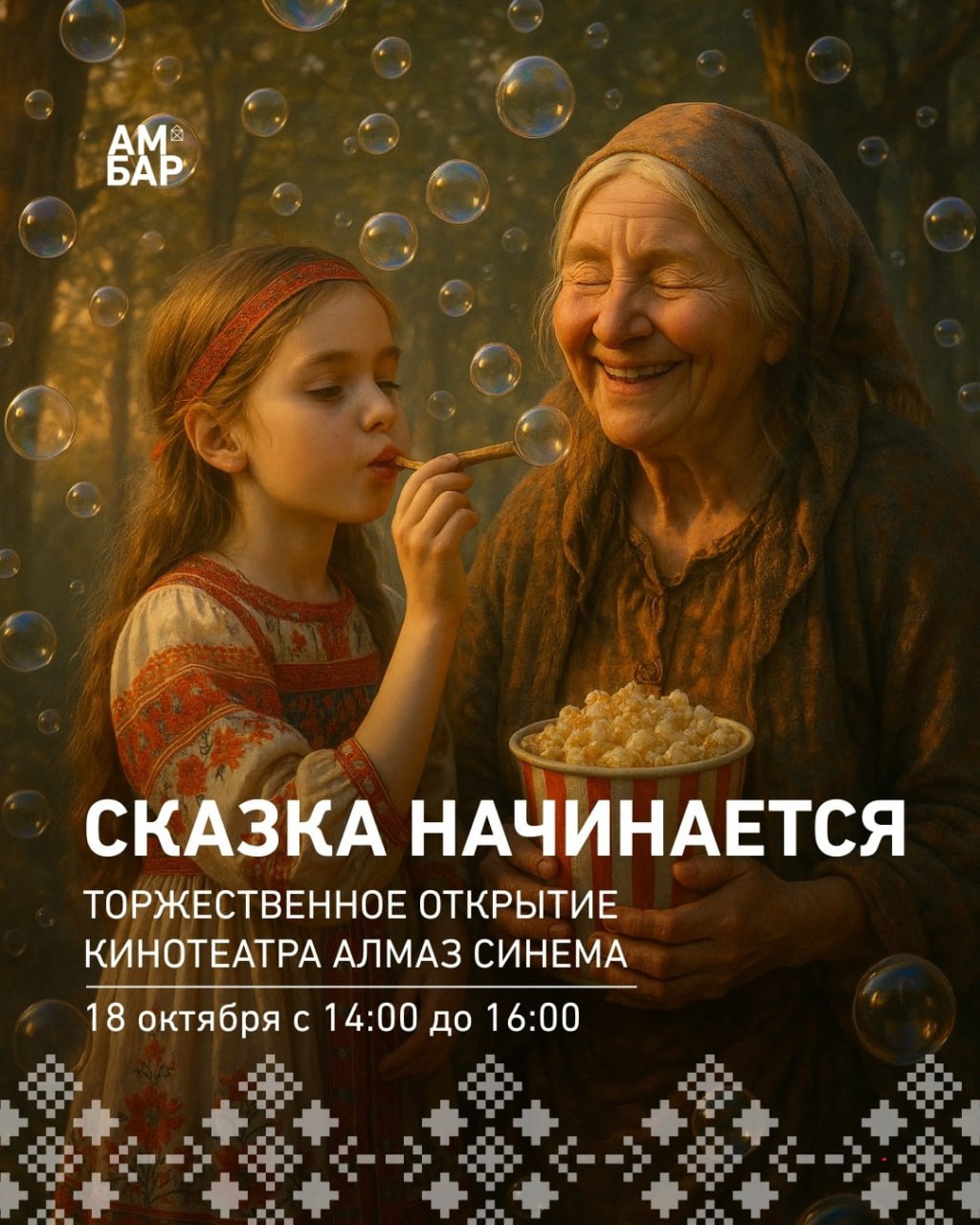 18 октября с 14:00 до 16:00 сказка начнётся прямо в ТК «Амбар» — приглашаем на торжественное открытие нового кинотеатра «Алмаз Синема»!