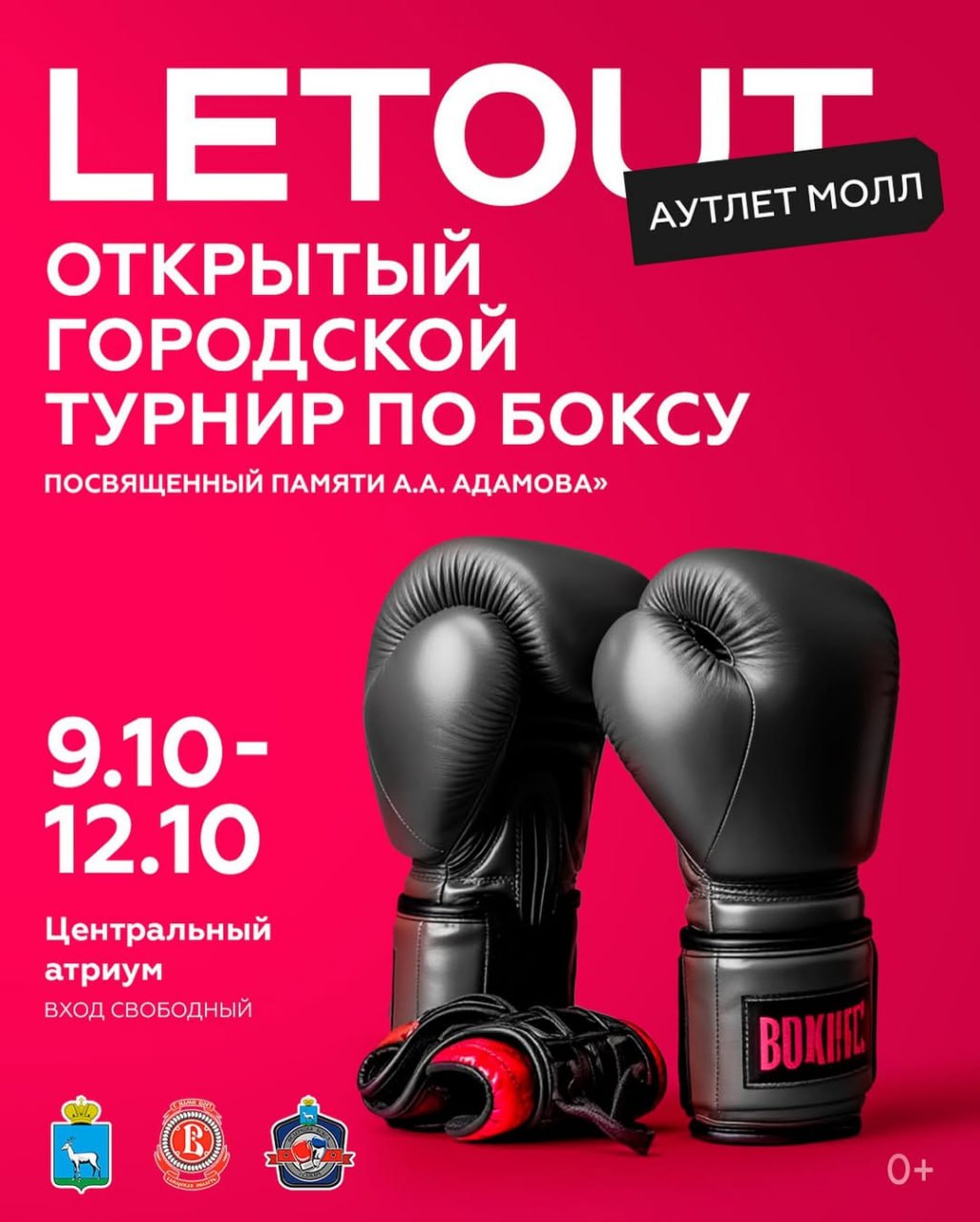 С 9 по 12 октября в центральном атриуме LETOUT состоится турнир городского округа Самара по боксу среди юношей и девочек 2012 г.р. и старше, посвящённый памяти А.А. Адамова.