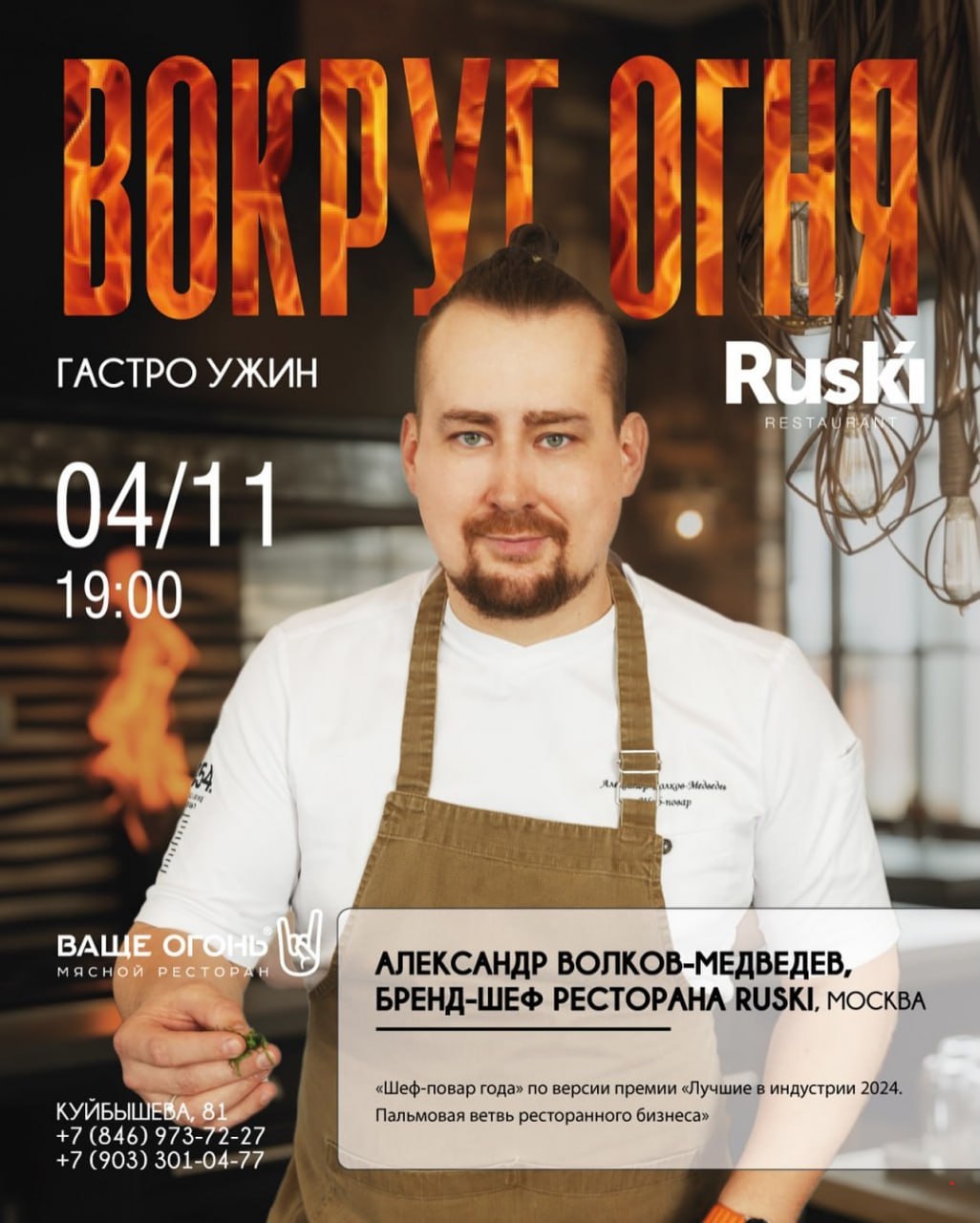 В этот особенный вечер Александр Волков-Медведев представит концепцию «Ужин в огне» — коллекцию самых знаменитых и проверенных временем хитов своей кухни, приготовленных специально для вас на открытом огне или в русской печи, но уже в стенах «Ваще Огонь».