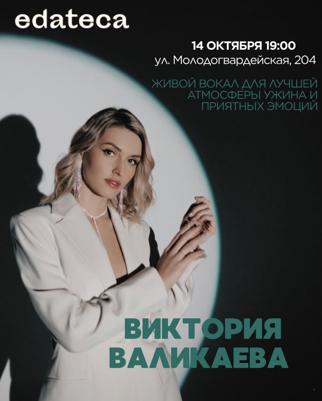 Уже 14 октября в 19:00 Ваш ужин станет ещё более особенным благодаря волшебному вокалу выдающейся Виктории Валикаевой. Приглашаем вас на незабываемый вечер в ресторане «Едатека» по адресу Молодогвардейская, 204.