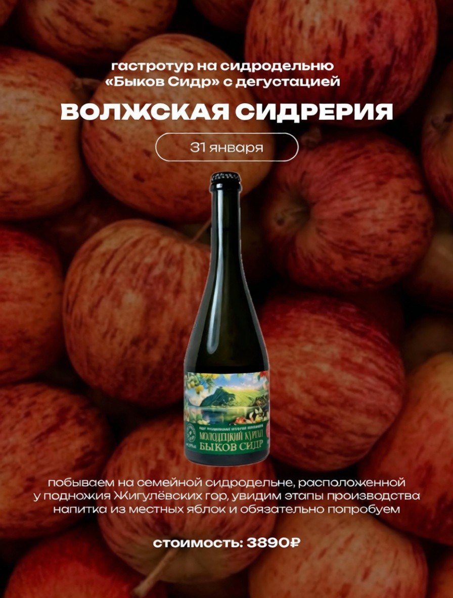 Нам предстоит посетить семейную сидродельню. Её владелец с детства любил жигулёвские яблоки и, закупив самое современное оборудование и изучив все тонкости виноделия и соковарения, открыл собственное дело. Мы побываем на производстве, познакомимся с собственником проекта и разделим любовь к местным яблокам — продегустируем лучшие сорта сидра.