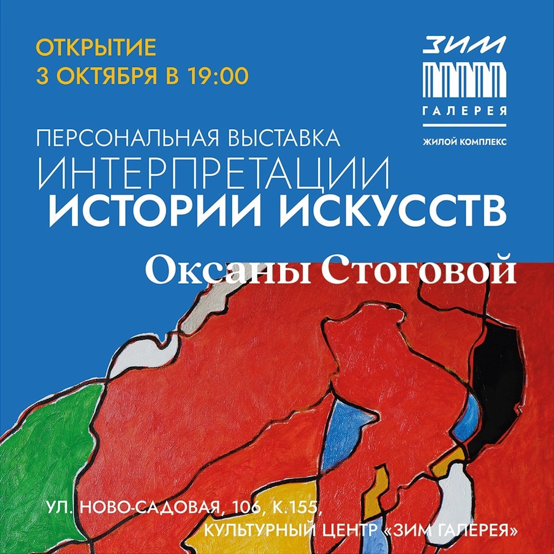 В «Интерпретации истории искусств» Оксана Стогова анализирует работы знаменитых художников и переносит на холст свои эмоции, связанные с их творчеством. Проект делится на две равные части: анализ и синтез. В анализе художница раскладывает колористические составляющие на прямые горизонтальные полосы, а в синтезе применяет практику дадаистов и теории случайности, чтобы через телесность определить свою точку координат в этом мире.